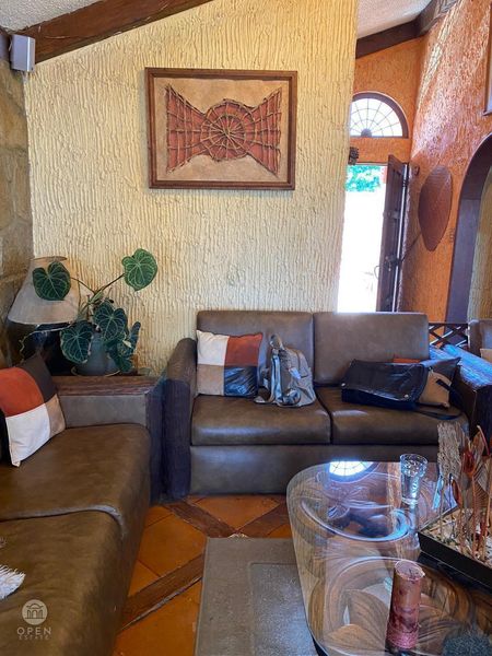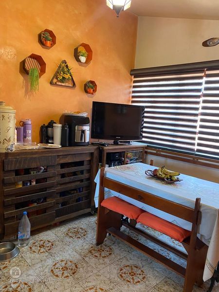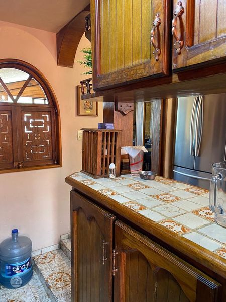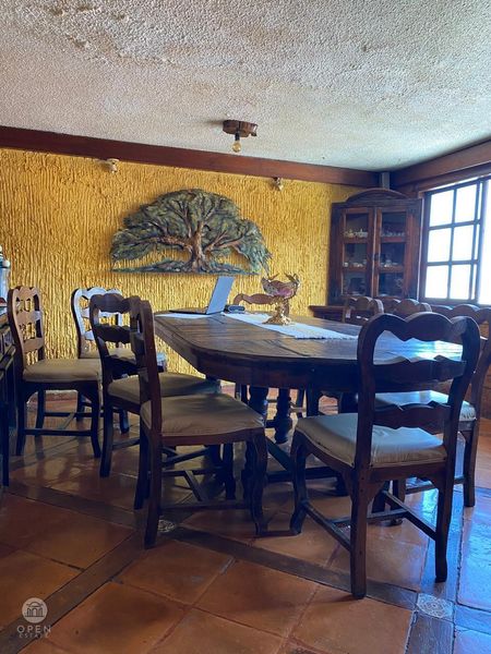 Sala y comedor con ambiente relajado y familiar con terminados rústicos o coloniales, ,medio baño , cocina integral , terraza para agradables reuniones junto a la alberca.